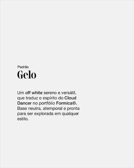 Entre as opções no Portfólio da Formica® mais próximas a cor escolhida pela Pantone, Bruna destaca o padrão Gelo como uma boa possibilidade: “um off-white versátil, suave e equilibrado, que harmoniza com diferentes atmosferas e permite múltiplas leituras”, destaca.