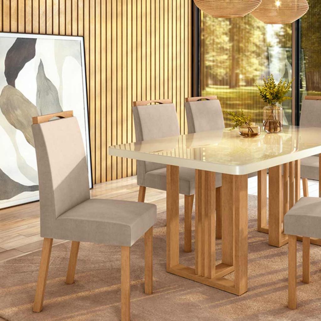 Design contemporâneo, funcionalidade e responsabilidade ambiental compõem o DNA da linha Téssera, aposta da Móveis Lopas para renovar o espaço da sala de jantar com elegância e conforto. A coleção é composta por mesa com tampo de vidro off white e base em madeira maciça na cor amêndoa, combinada a cadeiras estofadas com pés em madeira maciça.