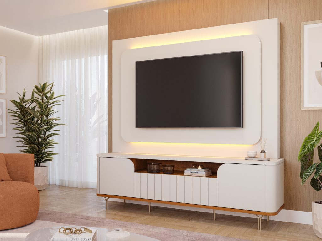 Produzido em 100% MDF, o Home Diamantina alia resistência, acabamento superior e design contemporâneo. Com linhas retas e nichos funcionais, o modelo equilibra estética elegante e praticidade para o dia a dia. O painel comporta TVs de até 75”, conta com prateleiras laterais para objetos decorativos e espaço para eletrônicos, além de porta basculante equipada com dobradiças slow motion, que garantem suavidade no manuseio.