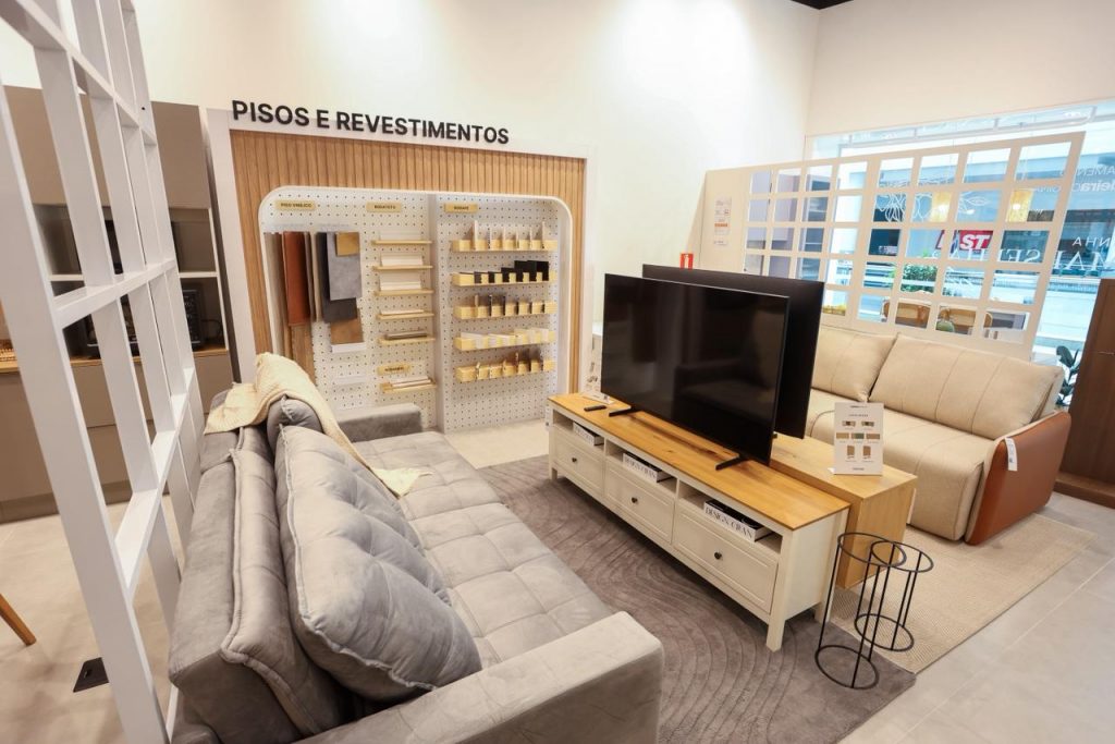 No modelo adotado pela MadeiraMadeira Curitiba, os espaços são estruturados para simular ambientes reais da casa. Móveis, itens de decoração, revestimentos e materiais de construção são apresentados de forma integrada, o que facilita a visualização das soluções.