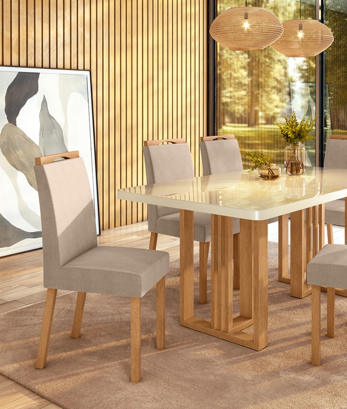 Design contemporâneo, funcionalidade e responsabilidade ambiental compõem o DNA da linha Téssera, aposta da Móveis Lopas para renovar o espaço da sala de jantar com elegância e conforto. A coleção é composta por mesa com tampo de vidro off white e base em madeira maciça na cor amêndoa, combinada a cadeiras estofadas com pés em madeira maciça.