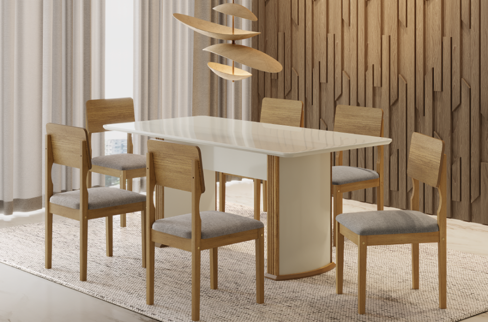 A mesa Maia, combinada à cadeira Ana, da Valdemóveis, reúne atributos que dialogam diretamente com a dinâmica atual do ponto de venda: versatilidade de composição, presença visual equilibrada e opções que ampliam o poder de escolha do consumidor. O conjunto parte de uma lógica clara de personalização, permitindo diferentes leituras de produto dentro de uma mesma linha.