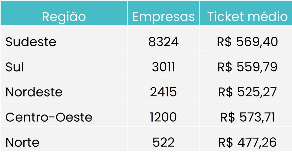 Na análise regional, o Centro-Oeste apresentou o maior ticket médio, com R$ 573,71, seguido por Sudeste (R$ 569,40), Sul (R$ 559,79) e Nordeste (R$ 525,27). O Norte aparece com o menor valor, R$ 477,26, refletindo diferenças estruturais no mercado de trabalho e na política de reconhecimento das empresas.